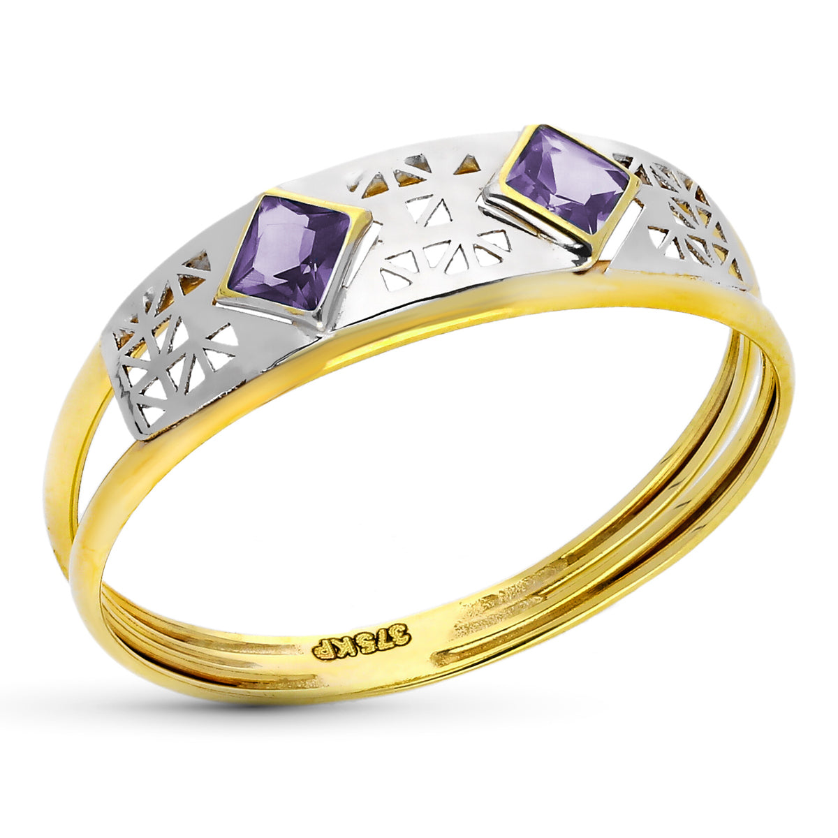 9K SORTIJA ORO BICOLOR DOS CUERPOS CON CALADO Y CIRCONITA AMATISTA. ANCHO: 5.5 MM