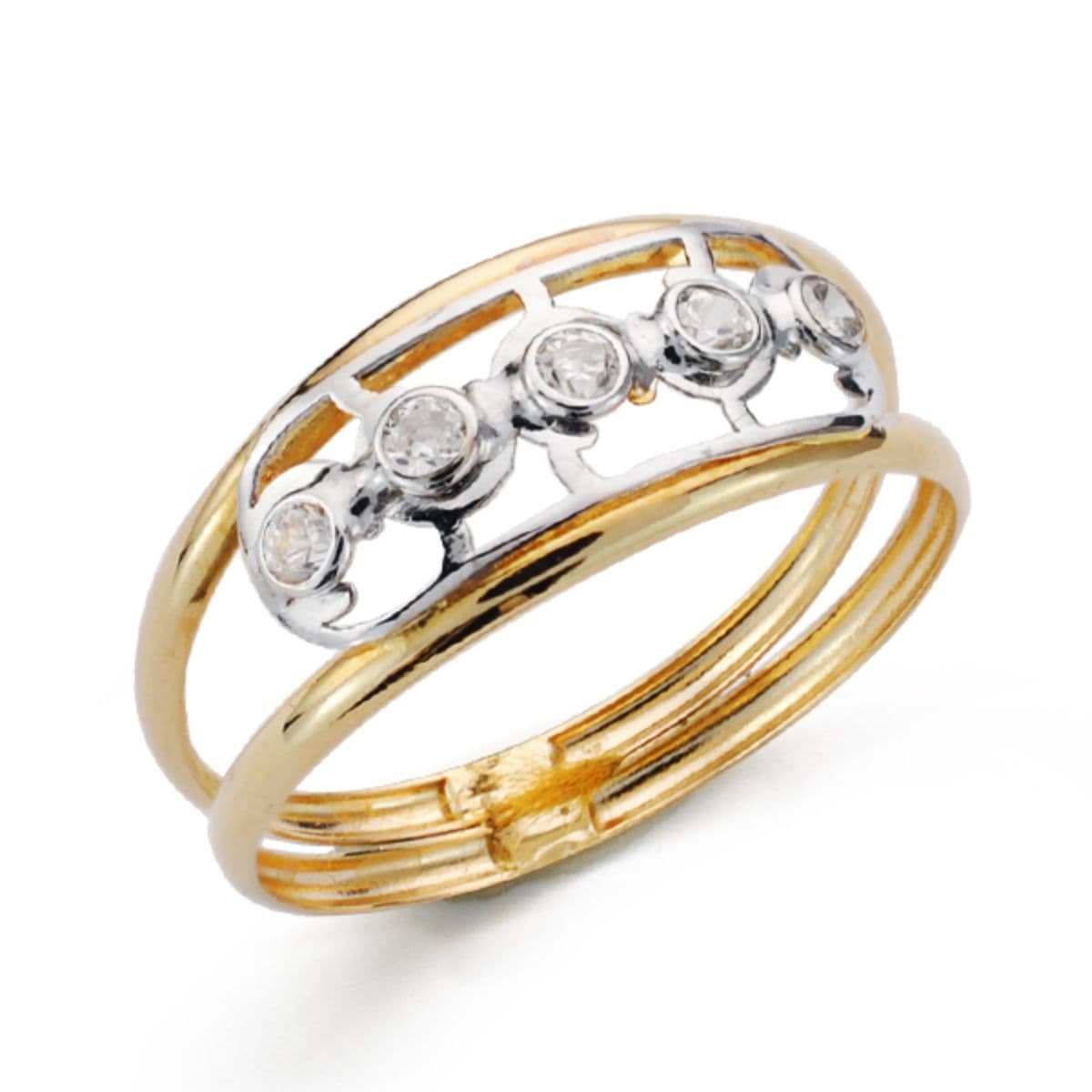 18K SORTIJA ORO BICOLOR DOS CUERPOS CON MOTIVO CALADO Y CIRCONITAS. ANCHO: 8 MM