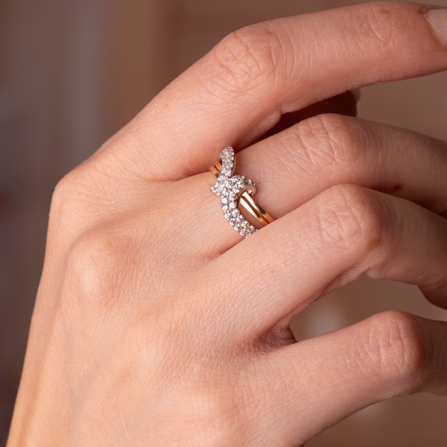 18K SORTIJA ORO BICOLOR CALADA CON MOTIVO CRUZADO DE CIRCONITAS. ANCHO 8MM