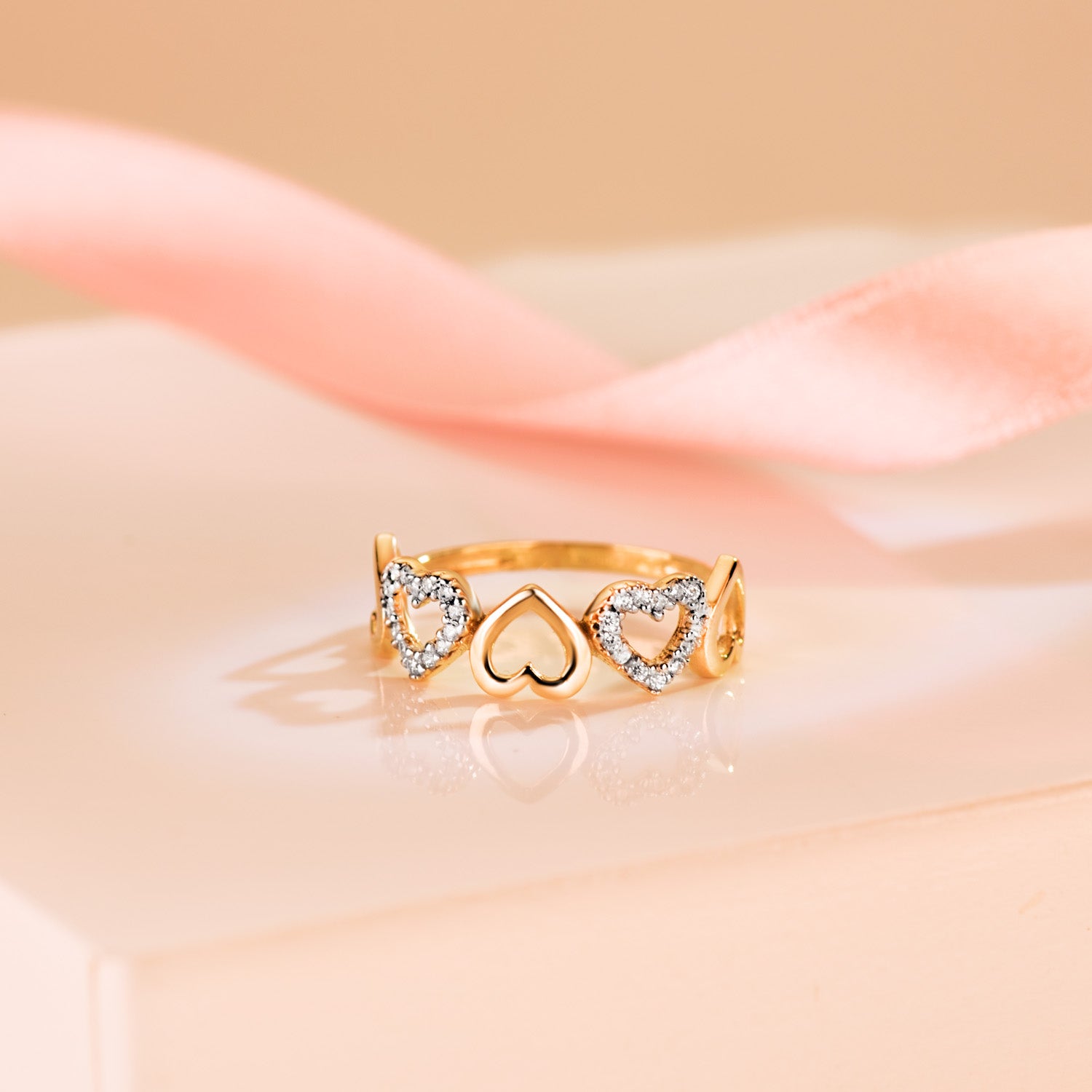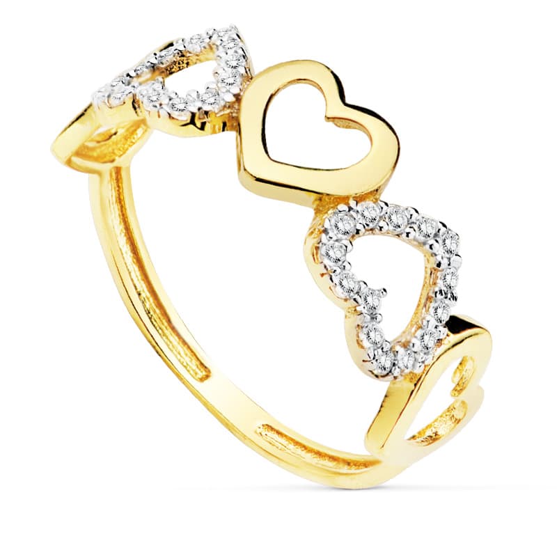 18K SORTIJA ORO BICOLOR CINCO CORAZONES LISOS Y CON CIRCONITAS. ANCHO: 7 MM