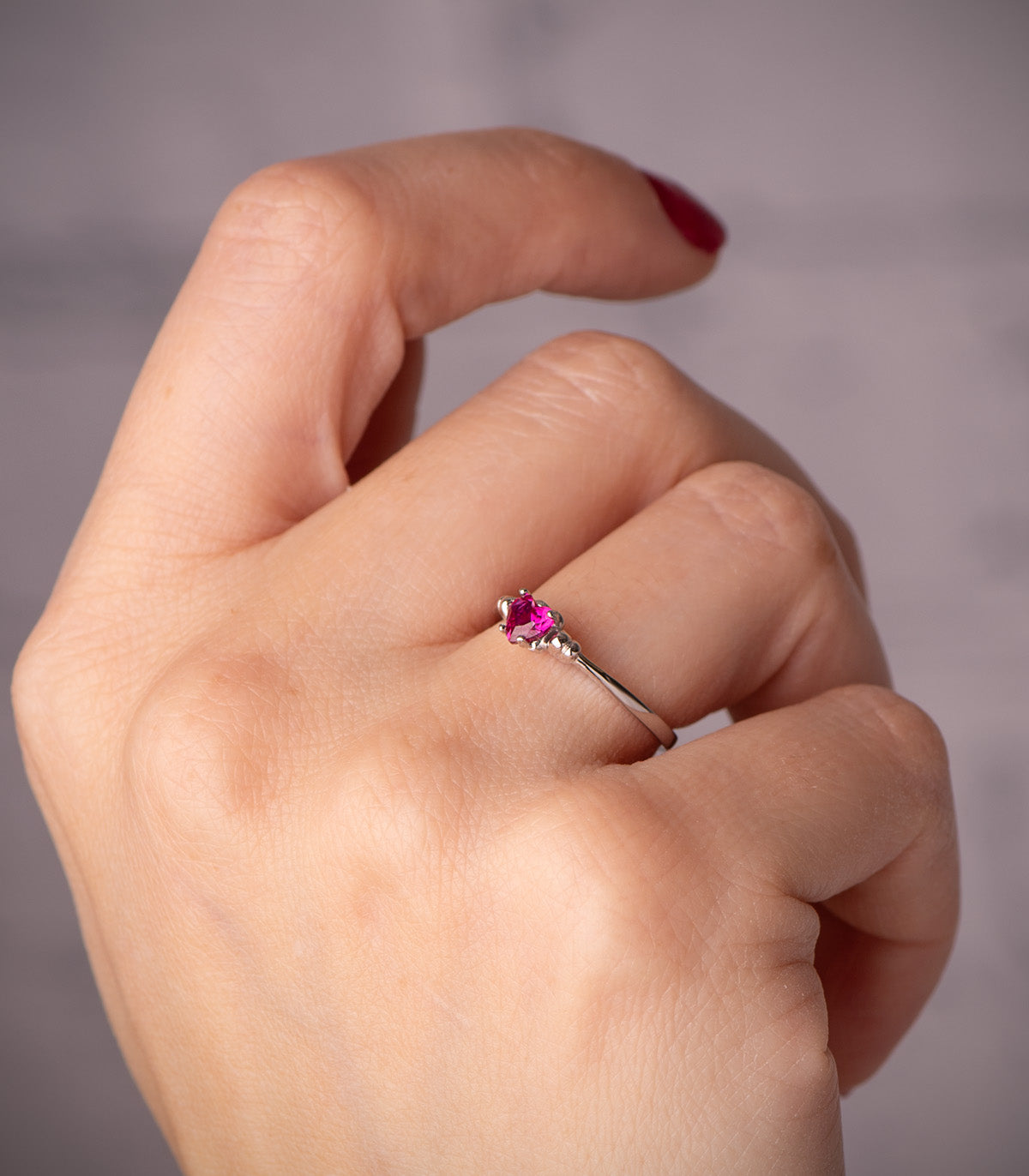 18K SORTIJA ORO BLANCO CORINDON RECONSTRUIDO CORAZON RUBI 4X4 MM CON GALLONES.