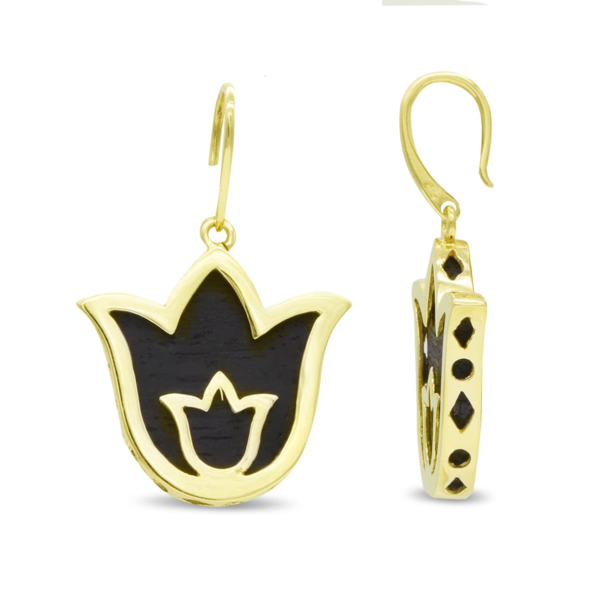 18K PENDIENTES ORO AMARILLO EBANO Y TULIPAN CIERRE GANCHO