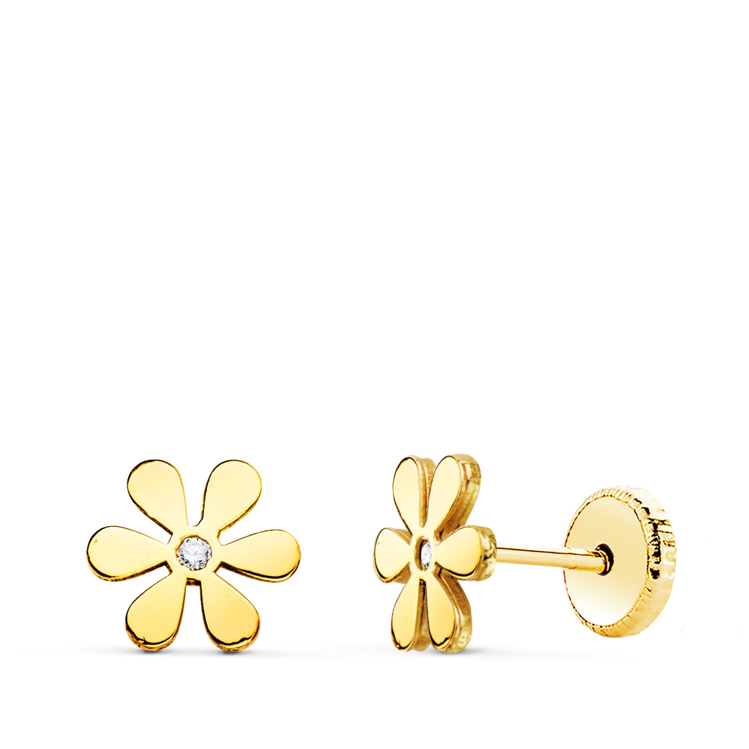 18K PENDIENTES ORO AMARILLO FLOR 6 PETALOS Y CIRCONITA 6X6MM. CIERRE TUERCA