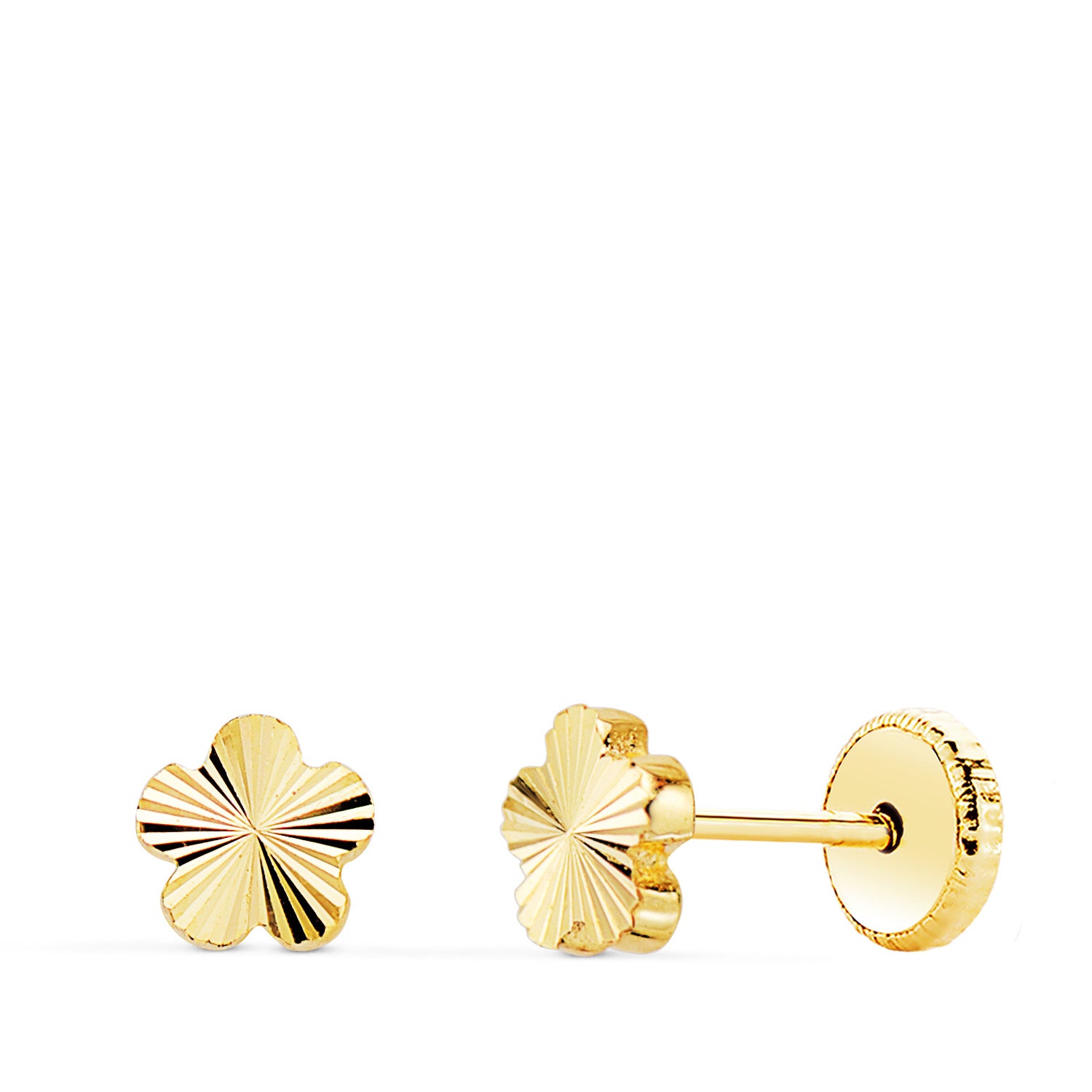 18K PENDIENTES ORO AMARILLO FLOR 5 PETALOS TALLADOS. 5 X 5 MM CIERRE TUERCA
