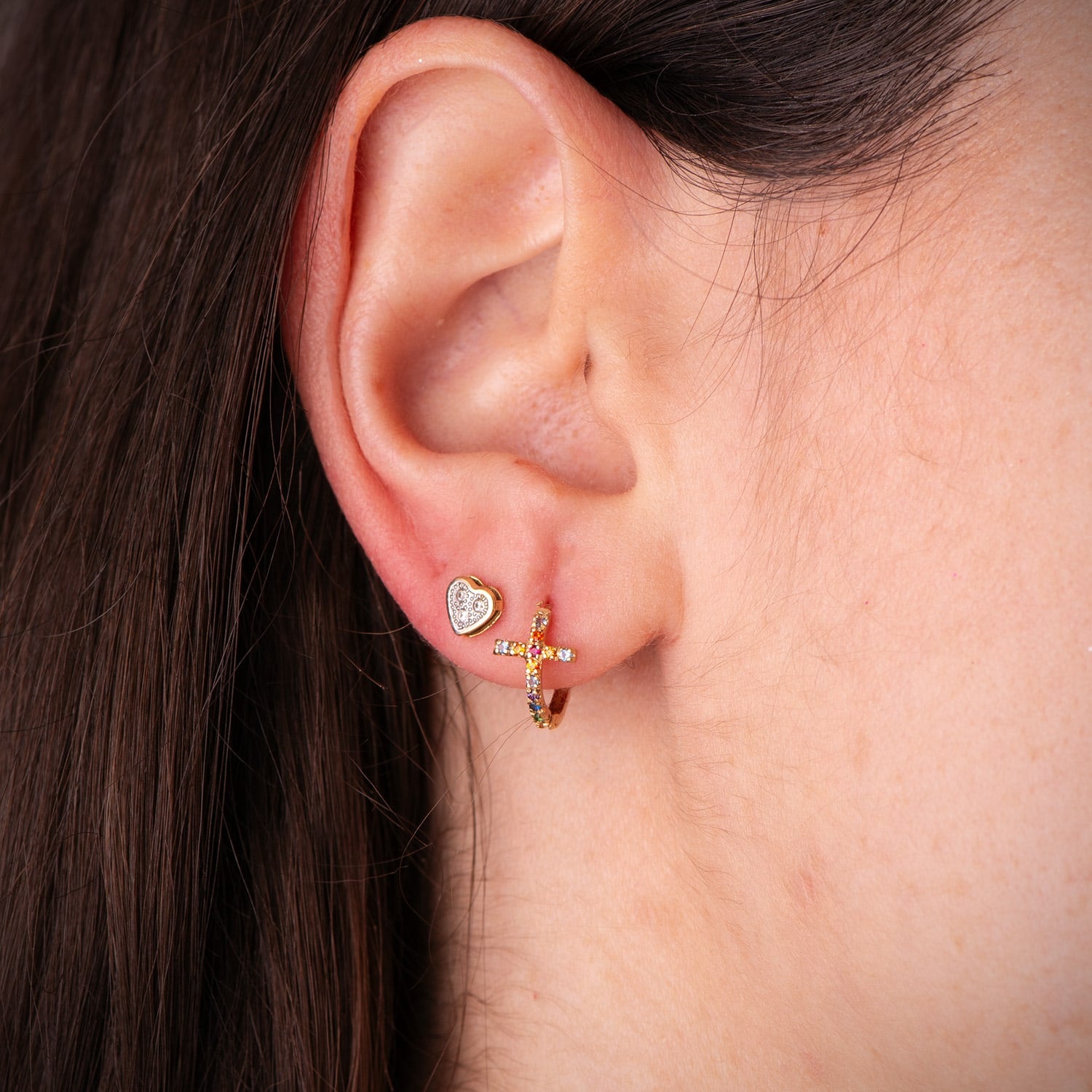 18K AROS ORO AMARILLO CRUZ CON CIRCONITAS COLORES. MEDIDA: 11 X 7 MM. CIERRE DE CLIP