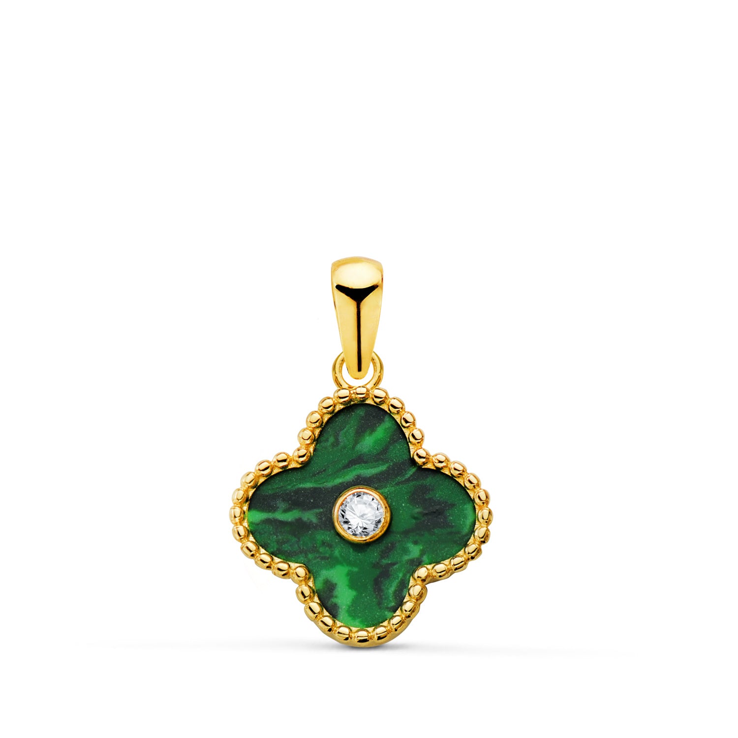 18K COLGANTE ORO AMARILLO TREBOL CERCO BOLITAS Y MALAQUITA CON CIRCONITA 12,5X12,5 MM.