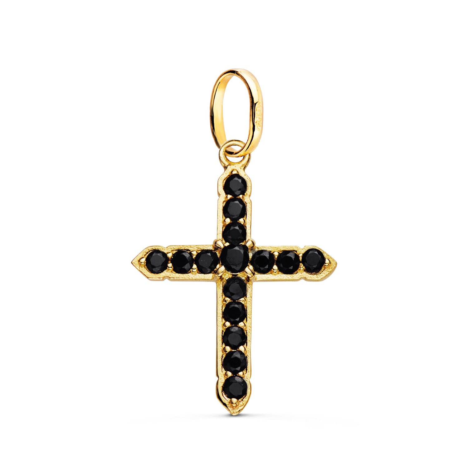 18K CRUZ ORO AMARILLO CON 15 CIRCONITA NEGRAS EN GARRAS. 24 X 18 MM