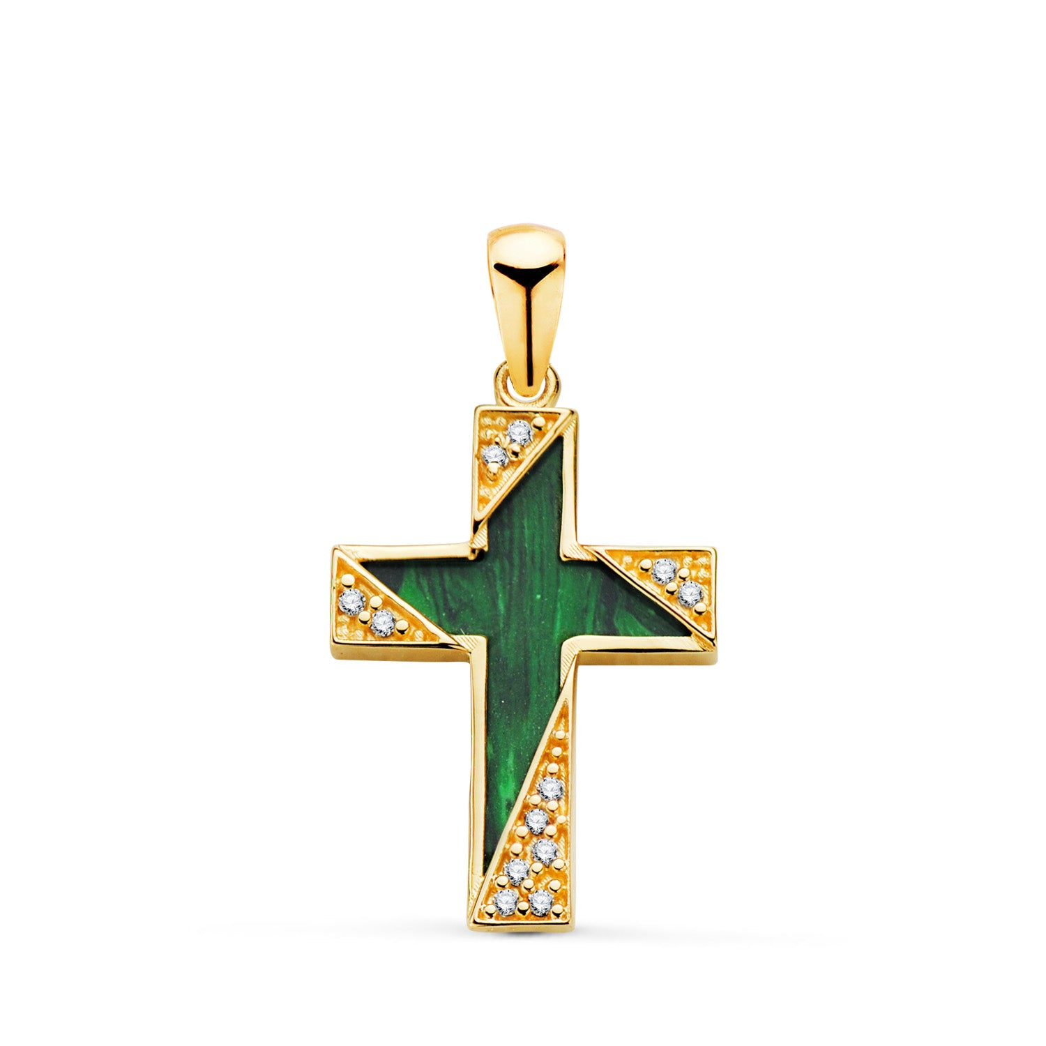 18K CRUZ ORO AMARILLO MALAQUITA DETALLES CON CIRCONITAS. MEDIDA: 19 X 12,5 MM