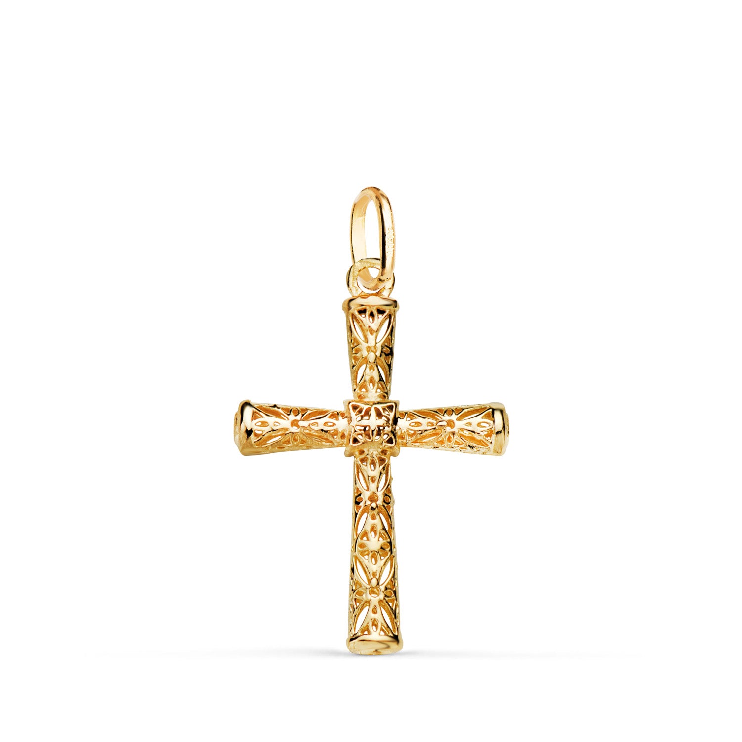 18K CRUZ ORO AMARILLO CALADA DETALLES FILIGRANA TUBO OVAL. MEDIDA: 22 X 15 MM.