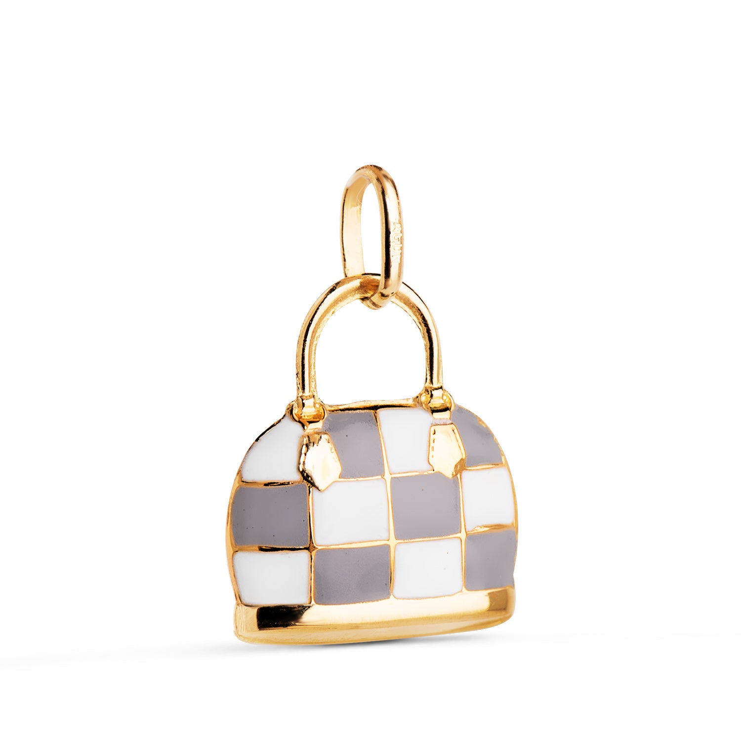 18K COLGANTE ORO AMARILLO BOLSO CON ESMALTE GRIS Y BLANCO. MEDIDA: 15 X 12,5 MM