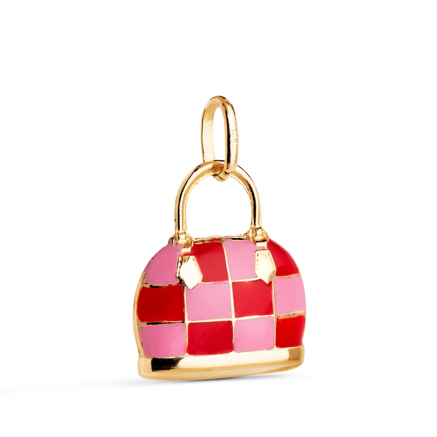 18K COLGANTE CHARM ORO AMARILLO BOLSO CON ESMALTE ROJO Y ROSA. MEDIDA: 15 X 12,5 MM