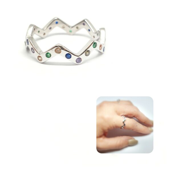 Anillo De Plata Zig Zag Con Circonitas Multicolor Marca Thaiba Bijoux Material Plata De Ley 925 Mm Tallas Disponibles: 12 14 16 18 Indique Su Talla En Informacion Adicional Del Pedido Se Presenta Perfectamente Estuchado.