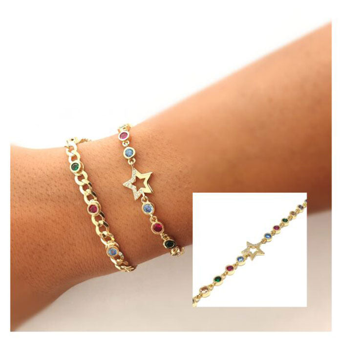 Pulsera Eslabon Multicolor Oro Pulsera Eslabones Pequenos Con Piedras De Diferentes Colores En Plata De Ley Con Bano De Oro 14 Quilates Cadena Extensible. Material Plata De Ley 925 Mm Esta Joyas Se Presenta Perfectamente Estuchada