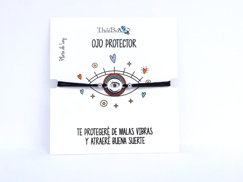 Collar de la Colección Vive - Joyas Con Mensaje. Pulsera ajustable de hilo con Ojo Protector, diseñada para alejar las malas energías y atraer buena suerte. Confeccionada en plata de ley y hilo multicolor, incluye una tarjeta con el mensaje mostrado en la imagen y se entrega en estuche.