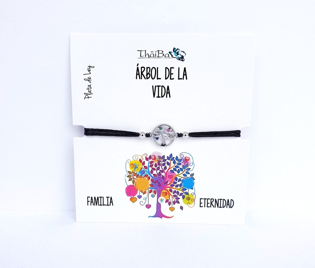 Collar de la colección Vive, perteneciente a Joyas Con Mensaje. Pulsera de hilo ajustable con diseño del Árbol de la Vida, símbolo de familia y eternidad. Fabricada en plata de ley y disponible en varios colores. Incluye tarjeta con el mensaje que aparece en la imagen y se entrega en estuche.
