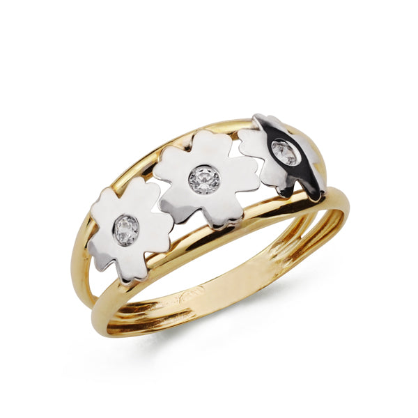 9K SORTIJA ORO BICOLOR DOBLE CUERPO CON FLORES Y CIRCONITAS. ANCHO: 7,5 MM