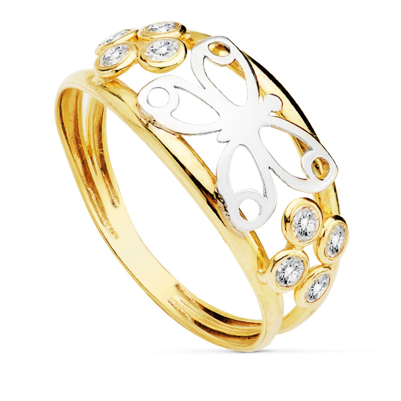 9K SORTIJA ORO BICOLOR DOBLE CUERPO CON MARIPOSA CALADA Y CIRCONITAS. ANCHO: 9 MM