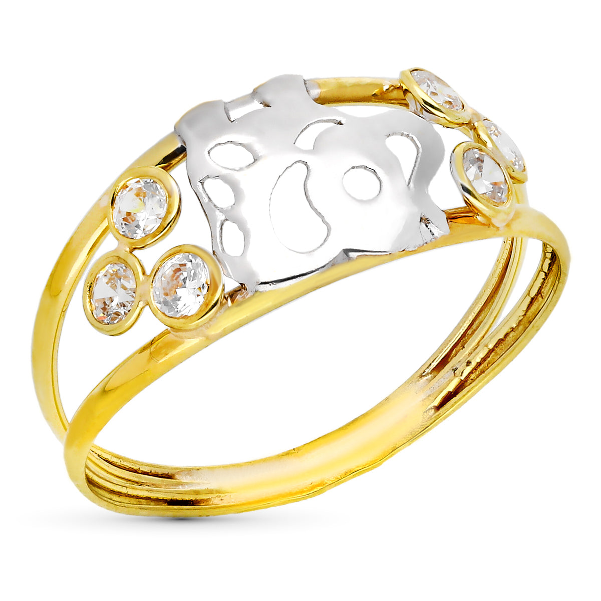 9K SORTIJA ORO BICOLOR DOBLE CUERPO CON ELEFANTE CALADO Y CIRCONITAS. ANCHO: 8 MM