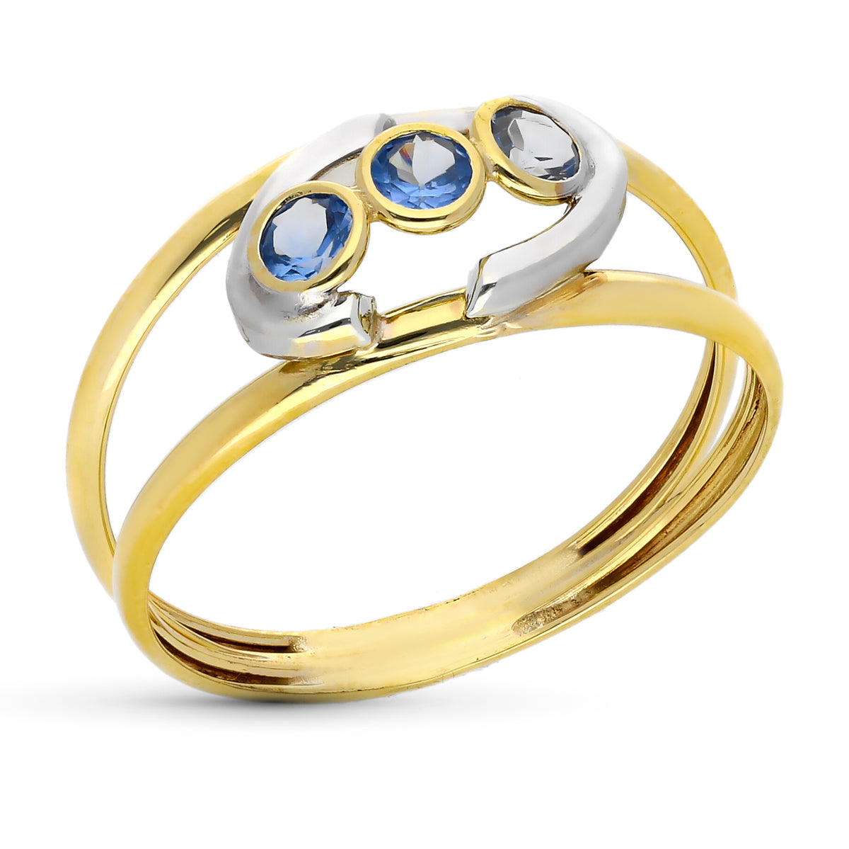 9K SORTIJA ORO BICOLOR DOBLE CUERPO MOTIVO CON CIRCONITAS COLOR AGUAMARINA. ANCHO: 8,5 MM