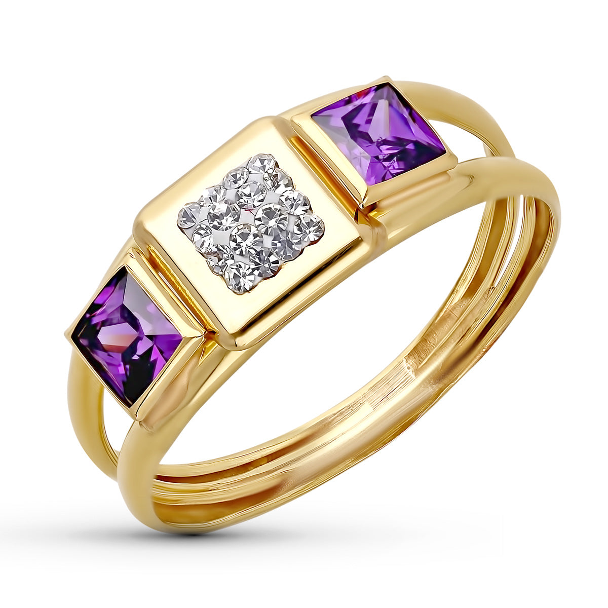 9K SORTIJA ORO AMARILLO DOBLE CUERPO CON CIRCONITAS AMATISTAS Y CUADRADO. ANCHO: 6,5 MM