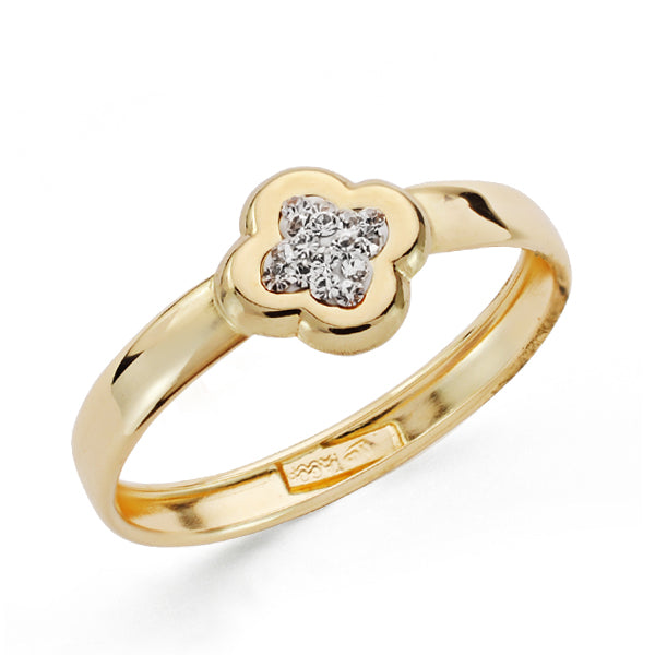 9K SORTIJA ORO AMARILLO BANDA CON TREBOL Y CIRCONITAS. ANCHO: 8 MM
