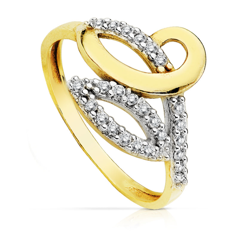 9K SORTIJA ORO BICOLOR HOJAS CALADAS CON CIRCONITAS. ANCHO: 13 MM