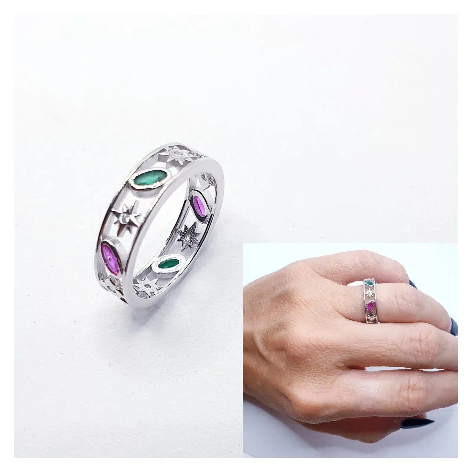 Anillo en plata de ley, con piedras verdes y rosas, intercaladas con soles y estrellas.