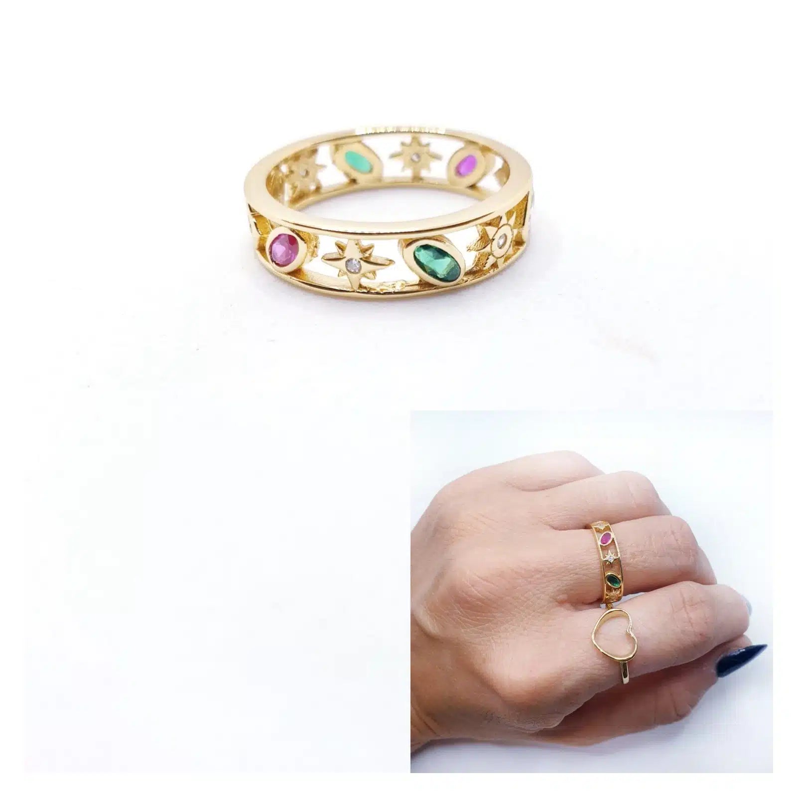 Anillo en plata de ley, bañado en oro 14 quilates, con piedras verdes y rosas, intercaladas con soles y estrellas.