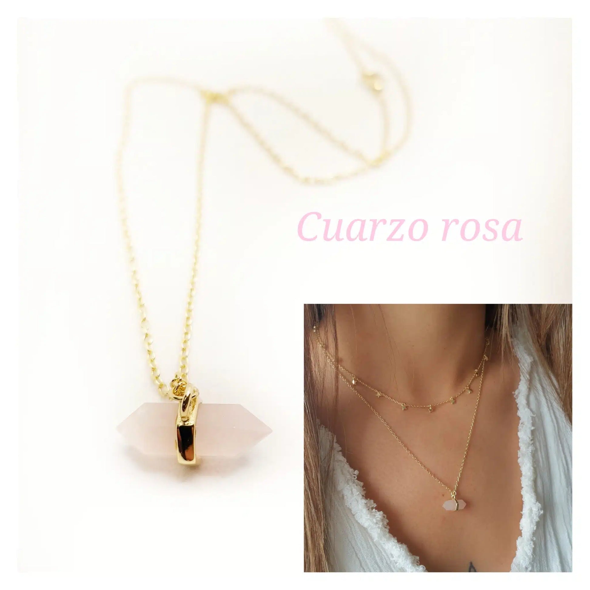 Collar piedra natural cuarzo rosa, en forma de prisma, piedra del amor. Plata de ley bañada en oro 14 quilates con cadena extensible a varias medidas.