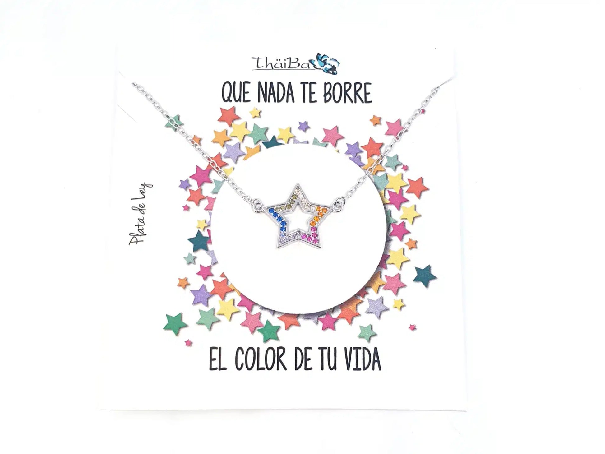 Collar de estrella rellena de circonitas de colores en plata de ley con cadena extensible a varias medidas.
