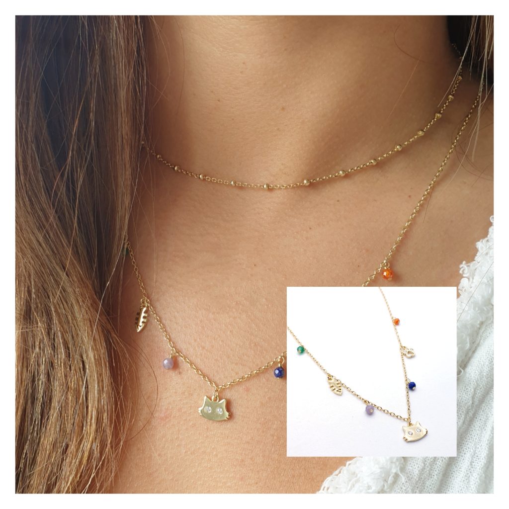 Collar gatit@ con piedritas de colores, raspa y huella de mascota en plata de ley bañada en oro 14 quilates con cadena extensible a varias medidas.