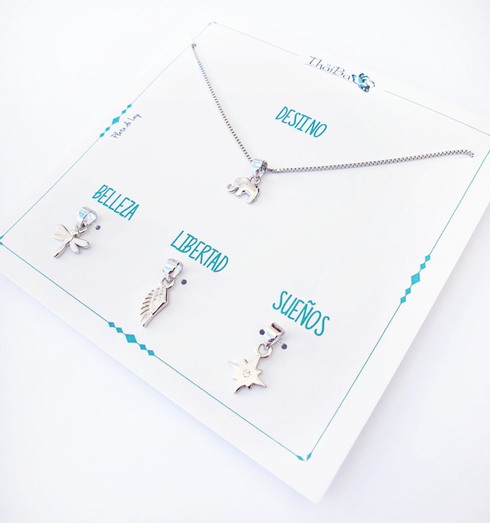 Collar con cuatro colgantes intercambiables y cadena extensible a varias medidas. Está compuesto por un elefante que simboliza suerte y destino, la libélula que va asociada a la belleza, un ala que representa la libertad y la estrella polar para los sueños que quedan por cumplir.