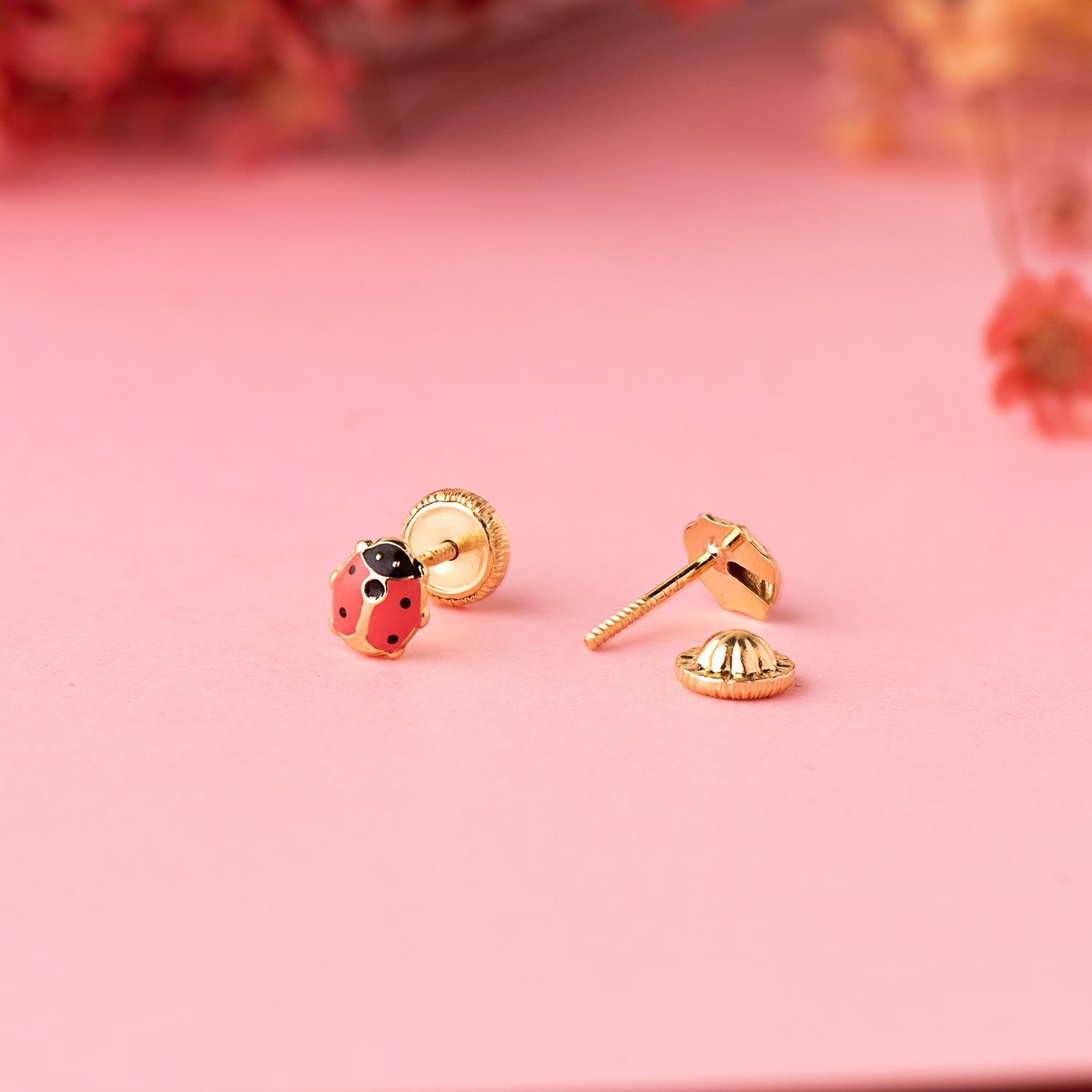 18K PENDIENTES ORO AMARILLO MARIQUITA ESMALTE ROSA 5 X 4,5 MM. CIERRE TUERCA