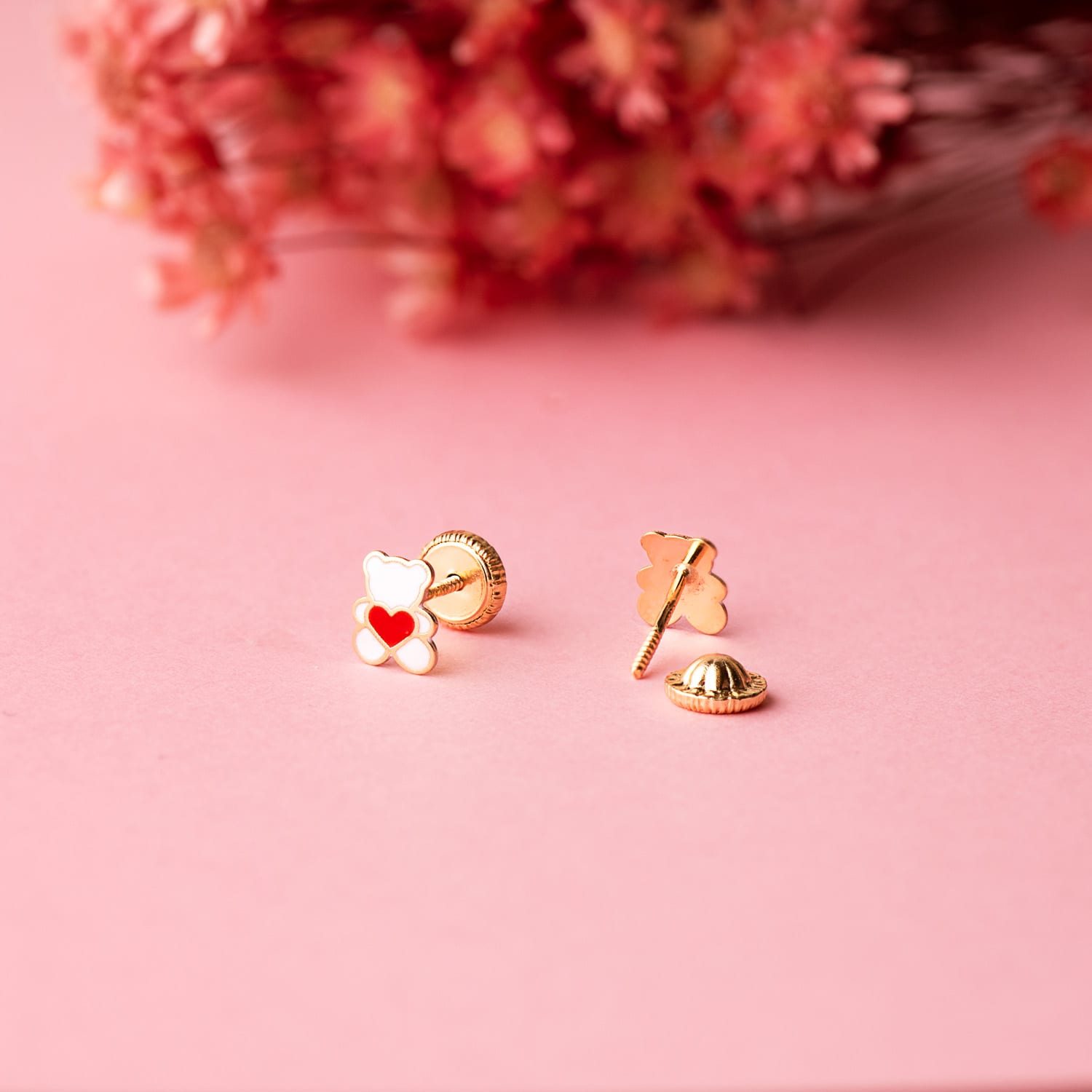 18K PENDIENTES ORO AMARILLO OSO ESMALTE BLANCO Y CORAZON. 6 X 4.5 MM. CIERRE TUERCA