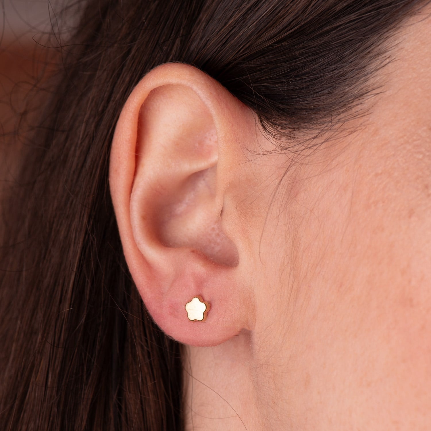 18K PENDIENTES ORO AMARILLO FLOR LISA BRILLO. 5,5 X 5,5 MM. CIERRE TUERCA