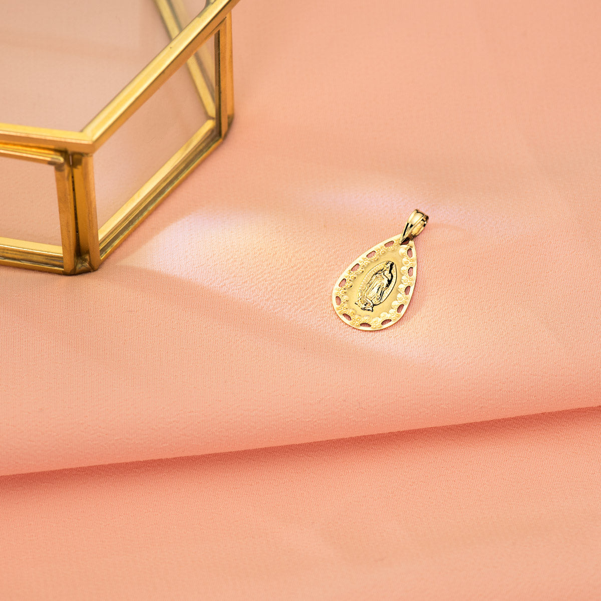 18K MEDALLA ORO AMARILLO VIRGEN DE GUADALUPE CERCO CALADO Y TALLADO 22X14 MM