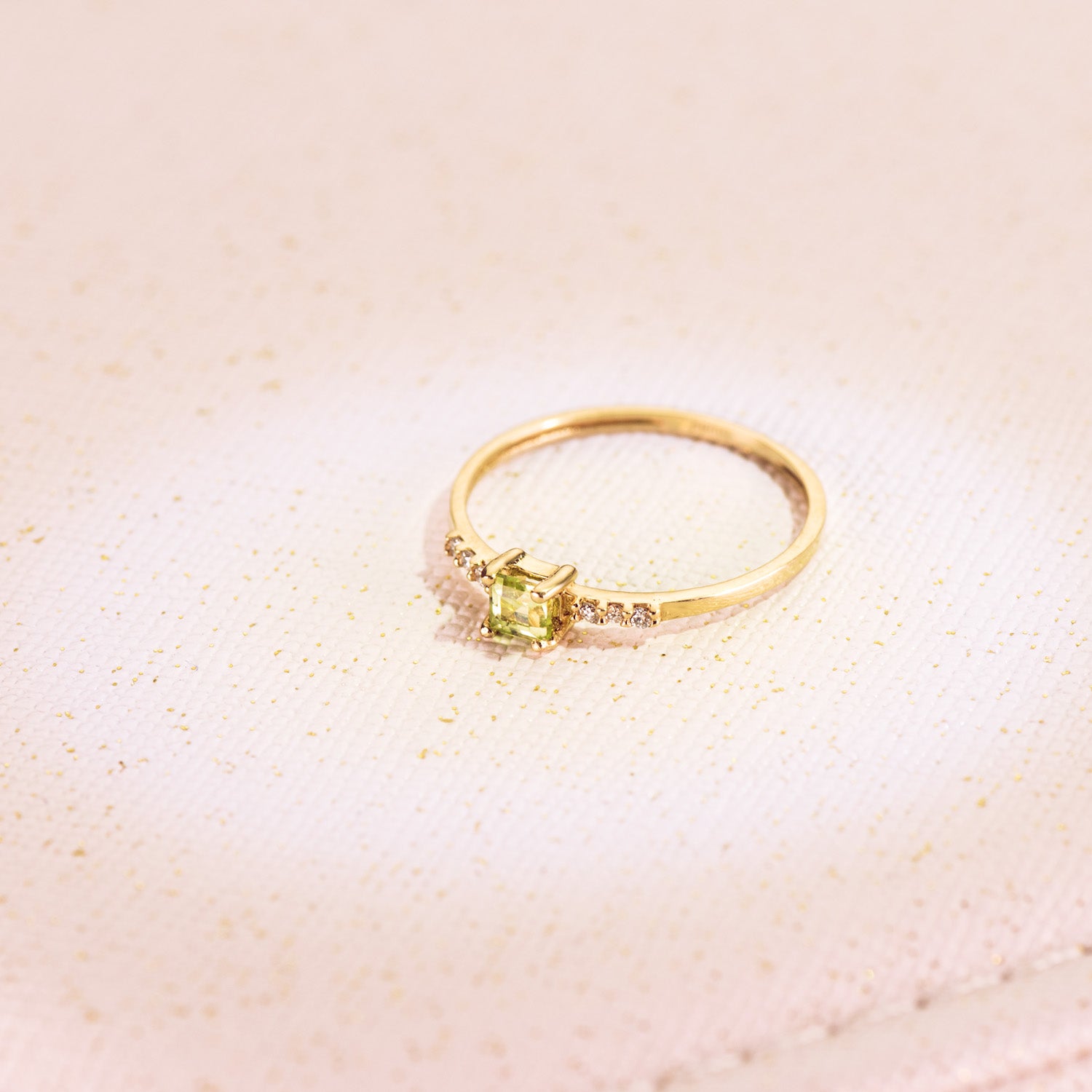 18K SORTIJA ORO AMARILLO 6 DIAMANTES 0,030 QTS. G-VS2. OLIVINA 3X3MM CUERPO 1 MM
