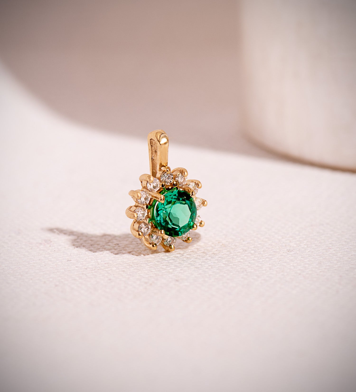 18K COLGANTE ORO AMARILLO 12 DIAMANTES DE LABORATORIO Y ESMERALDA RECRISTALIZADA 5 MM 0,48 QT 0,170 QTS. VS2-G. 13 X 9 MM