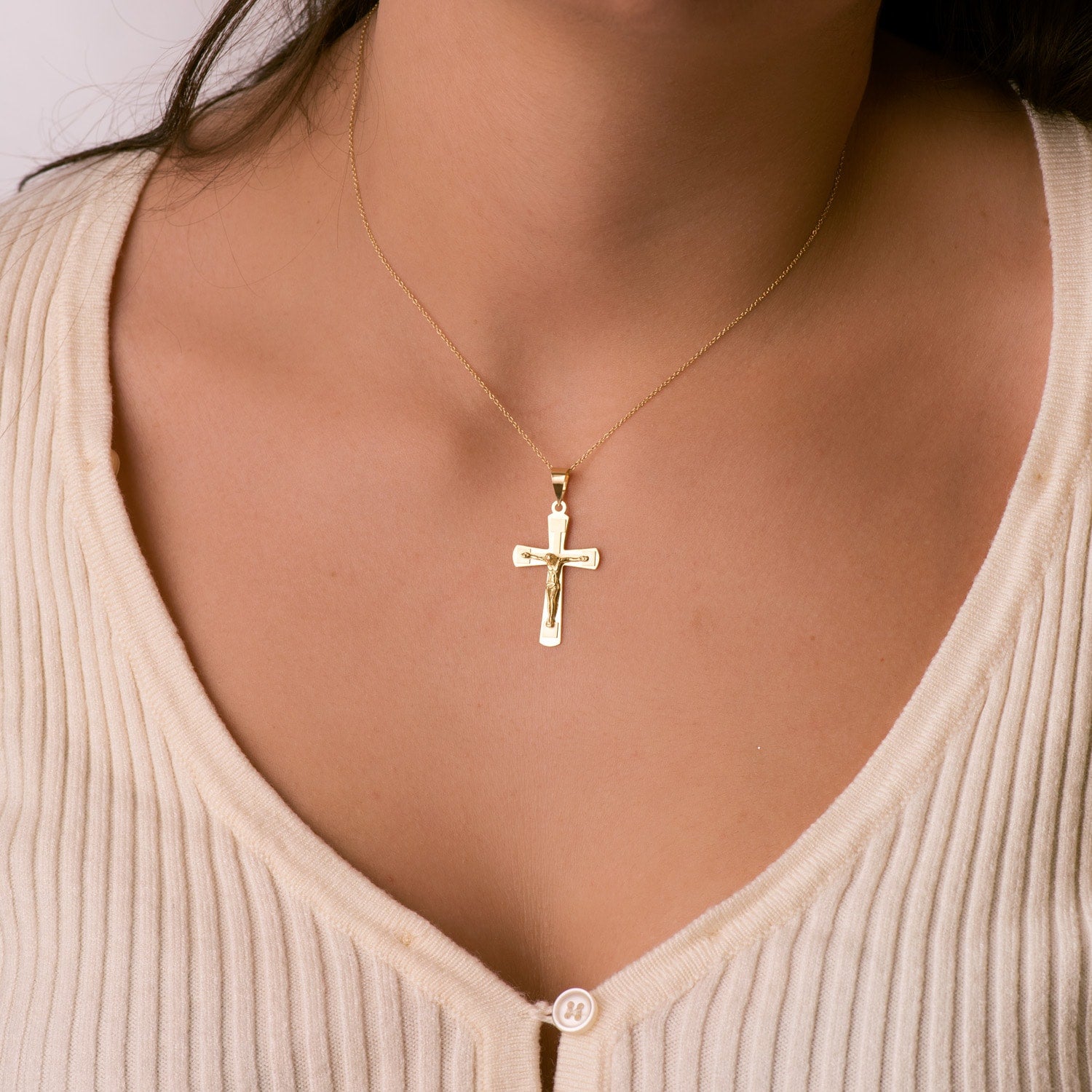18K CRUZ ORO AMARILLO BRILLO Y MATE CON CRISTO 32X20 MM