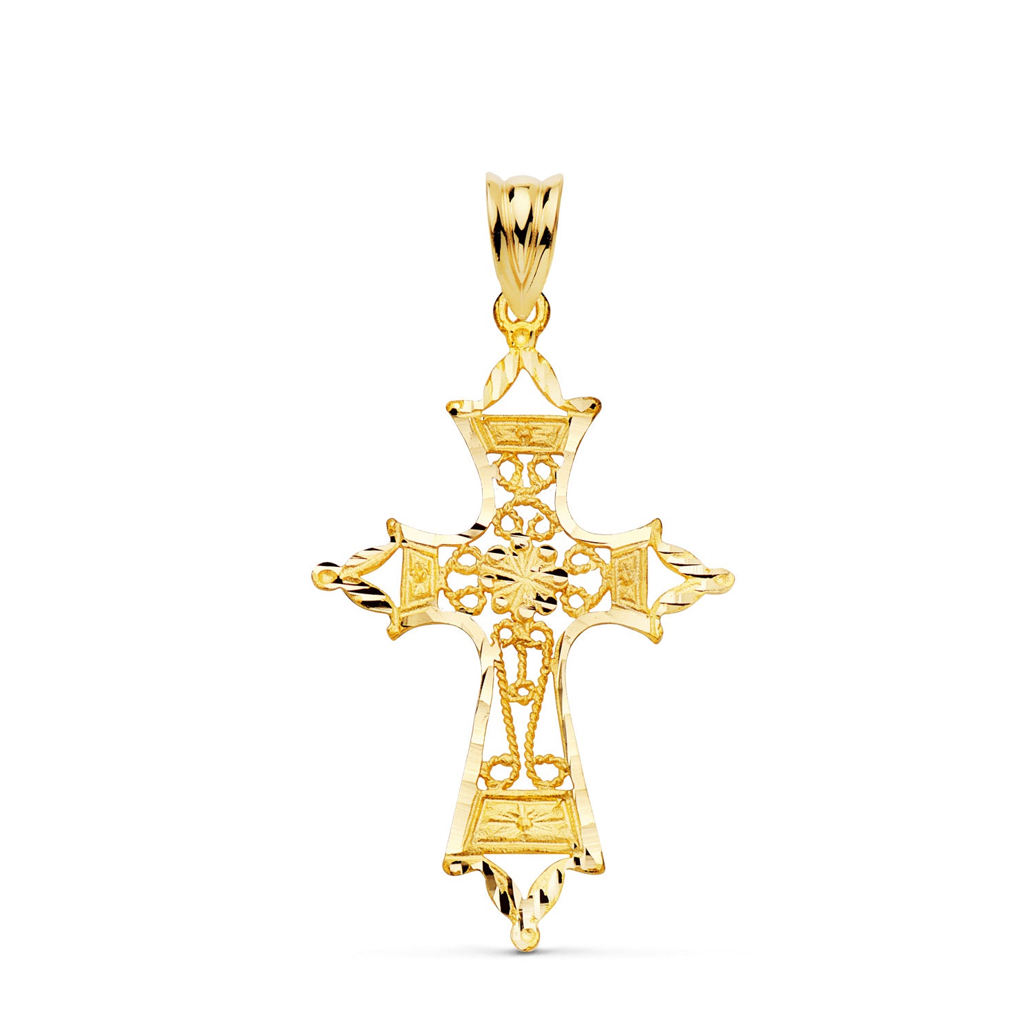 18K CRUZ ORO AMARILLO FILIGRANA BORDES TALLADOS. 37X25 MM