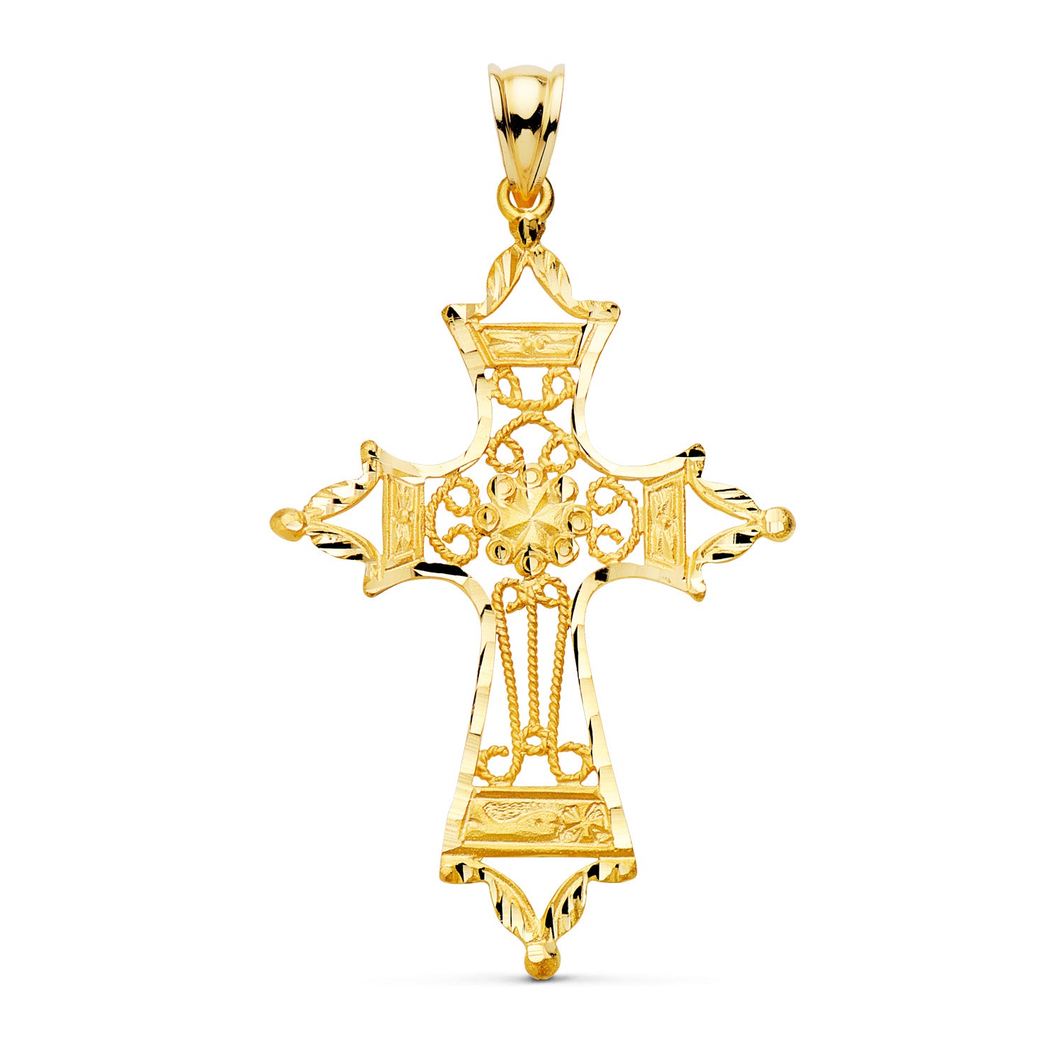 18K CRUZ ORO AMARILLO FILIGRANA BORDES TALLADOS. 46X30 MM