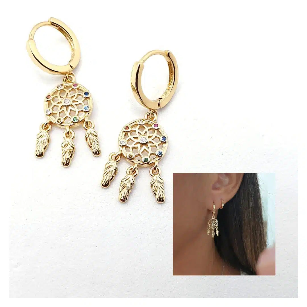 Pendientes atrapasueños en plata de ley bañada en oro 14 quilates y pequeñas circonitas de colores.