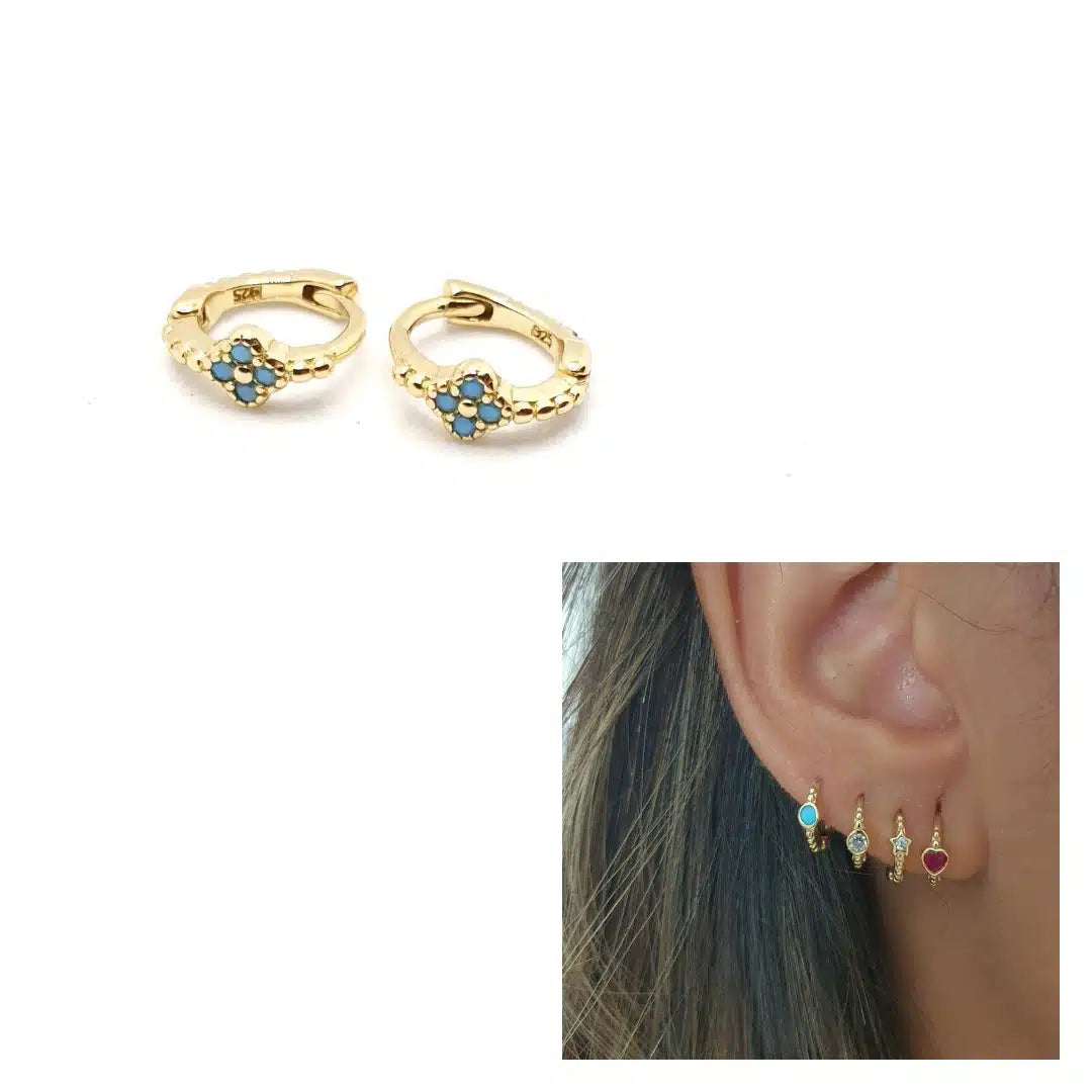 Pendiente mini ideal para segundos agujeros en plata de ley con baño de oro 14 quilates y flor turquesa central a 6 mm. ( precio 2 unidades )